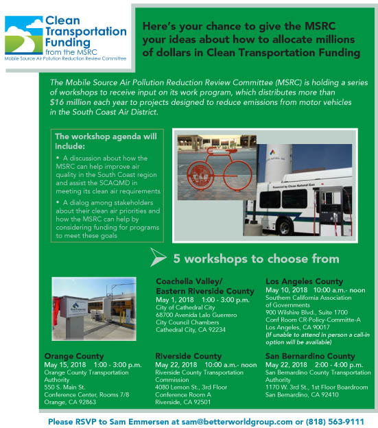 This May, the Mobile Source Air Pollution Reduction Review Committee (MSRC) will be holding a series of five regional workshops throughout the South Coast Air District to hear your ideas for clean transportation funding initiatives that stakeholders would like to see considered i0n the MSRC’s upcoming Work Program. The MSRC’s Work Program sets the project categories for which future funding will be available, such as alternative fuel vehicles and infrastructure, transportation demand management programs and other innovative projects geared toward reducing emissions from motor vehicles.