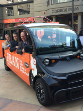 The MSRC partnered with the City of Anaheim to launch a free microtransit service called FRAN – Free Rides Around the Neighborhood (see photo). The City operates a fleet of all-electric Polaris GEM six-seater vehicles around the Center City area. The shared vehicles arrive on demand via FRAN’s smartphone application. The app contains points-of-interest information, and updates driving visitors in real time on where to park near FRAN pick-up spots. The MSRC helped the City invest in these electric vehicles in order to enhance clean mobility options around this typically congested area. FRAN does not follow fixed routes but rather visits several fixed stops based on riders’ pick-up and destination requests within the Center City area.