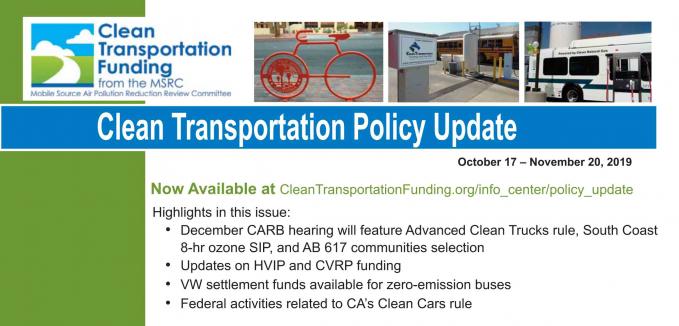 Please be advised the November 2019 edition of the MSRC's Clean Transportation Policy Update is now available for download. To view or download the Update, please use this link: http://www.cleantransportationfunding.org/sites/default/files/downloads/Nov_2019_update.pdf