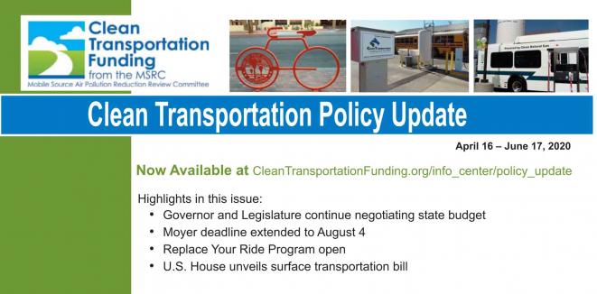 Please be advised the June edition of the MSRC's Clean Transportation Policy Update is now available for download. To view or download the Update, please use this link: http://www.cleantransportationfunding.org/sites/default/files/downloads/Jun_2020_update.pdf
