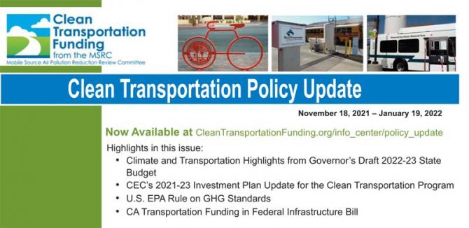 Please be advised the January edition of the MSRC's Clean Transportation Policy Update is now available for download. To view or download the Update, please use this link: http://www.cleantransportationfunding.org/sites/default/files/downloads/Jan_2022_update.pdf