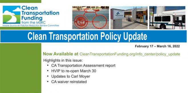 Please be advised the March edition of the MSRC's Clean Transportation Policy Update is now available for download. To view or download the Update, please use this link: http://www.cleantransportationfunding.org/sites/default/files/downloads/March%202022%20update.pdf