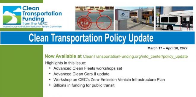 Please be advised the April edition of the MSRC's Clean Transportation Policy Update is now available for download. To view or download the Update, please use this link: http://www.cleantransportationfunding.org/sites/default/files/downloads/April%202022%20update.pdf