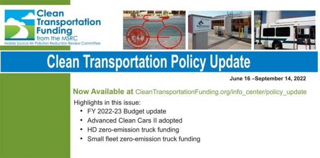 Please be advised the September edition of the MSRC's Clean Transportation Policy Update is now available for download. To view or download the Update, please use this link: http://www.cleantransportationfunding.org/sites/default/files/downloads/Sep_22_update.pdf