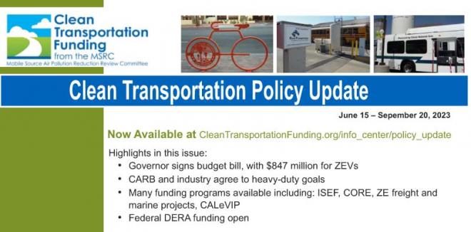 Please be advised the September edition of the MSRC's Clean Transportation Policy Update is now available for download. To view or download the Update, please use this link: http://www.cleantransportationfunding.org/sites/default/files/downloads/Sep_23_update.pdf