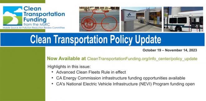 Please be advised the November edition of the MSRC's Clean Transportation Policy Update is now available for download. To view or download the Update, please use this link: http://www.cleantransportationfunding.org/sites/default/files/downloads/Nov%202023%20update.pdf