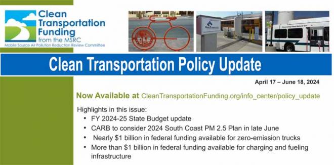 Please be advised the March edition of the MSRC's Clean Transportation Policy Update is now available for download. To view or download the Update, please use this link: http://www.cleantransportationfunding.org/sites/default/files/downloads/June%202024%20update.pdf