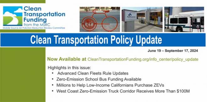 Please be advised the September edition of the MSRC's Clean Transportation Policy Update is now available for download. To view or download the Update, please use this link:http://www.cleantransportationfunding.org/sites/default/files/downloads/Sept_2024_update.pdf