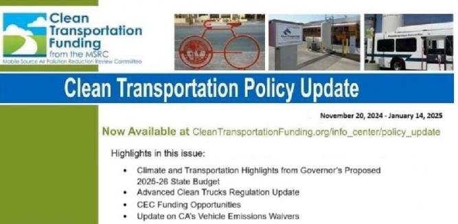 Please be advised the November edition of the MSRC's Clean Transportation Policy Update is now available for download. To view the Update, please use this link: http://www.cleantransportationfunding.org/sites/default/files/downloads/January%202025%20update.pdf